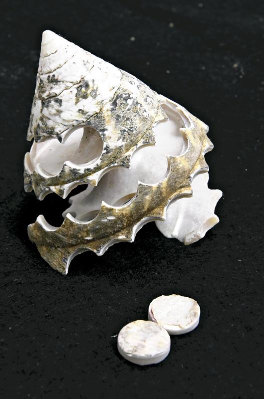 Each button is 8 to 40 millimeters in diameter and 1.5 to 5 millimeters in thickness. The company uses about 10 kinds of shells as raw materials and imports shells cut into the shape of a button from countries near the equator such as Papua New Guinea. At the plant, the button-shaped shells are sharpened on a whetstone into a uniform thickness and holes are punched. A lazer is used to carve letters into them.