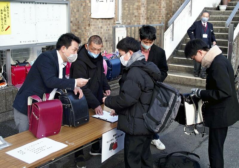 Students, parents and guardians brought used randoseru one after another to a collection site in front of the city-run Asuka Junior High School in Nara earlier this month.