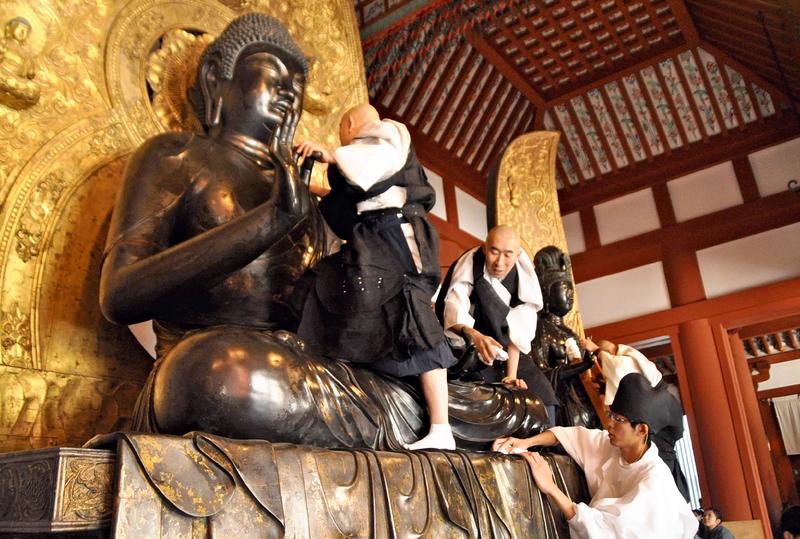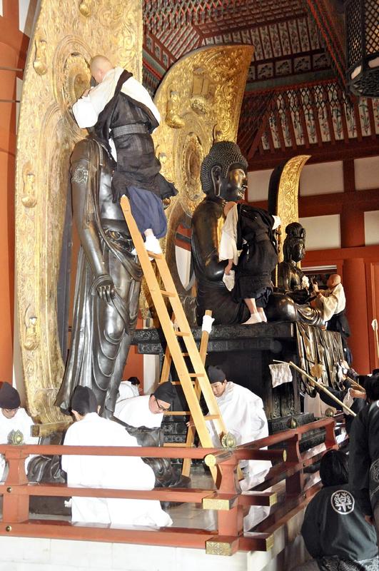 In the temple's Kondo hall, monks first put ladders on the statues while Choin Kato, the chief steward of the temple, and others read from sutras. They then meticulously cleaned the statues' faces, shoulders and even between gathers of robes with cloths soaked in hot water. About 50 people, including Buddhist monks and volunteer students, helped out in the event.