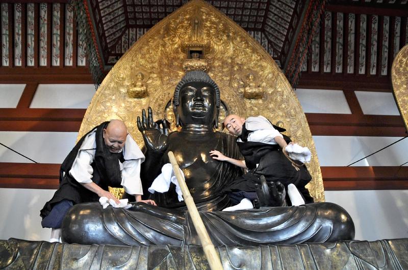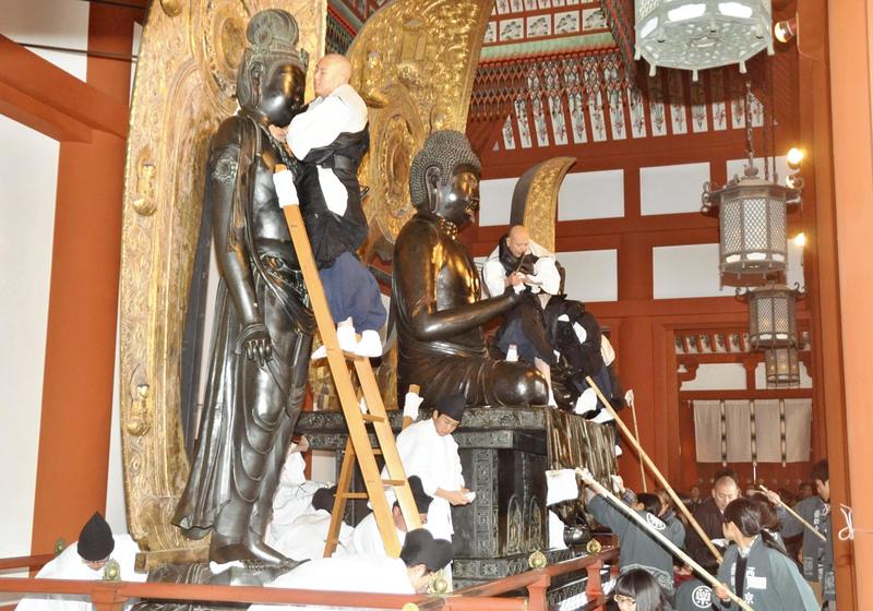 NARA -- Buddhist monks dusted off statues of the Buddha at Yakushiji temple in Nara on Saturday at the annual Ominugui (cleaning bodies) ceremony in preparation for the New Year.