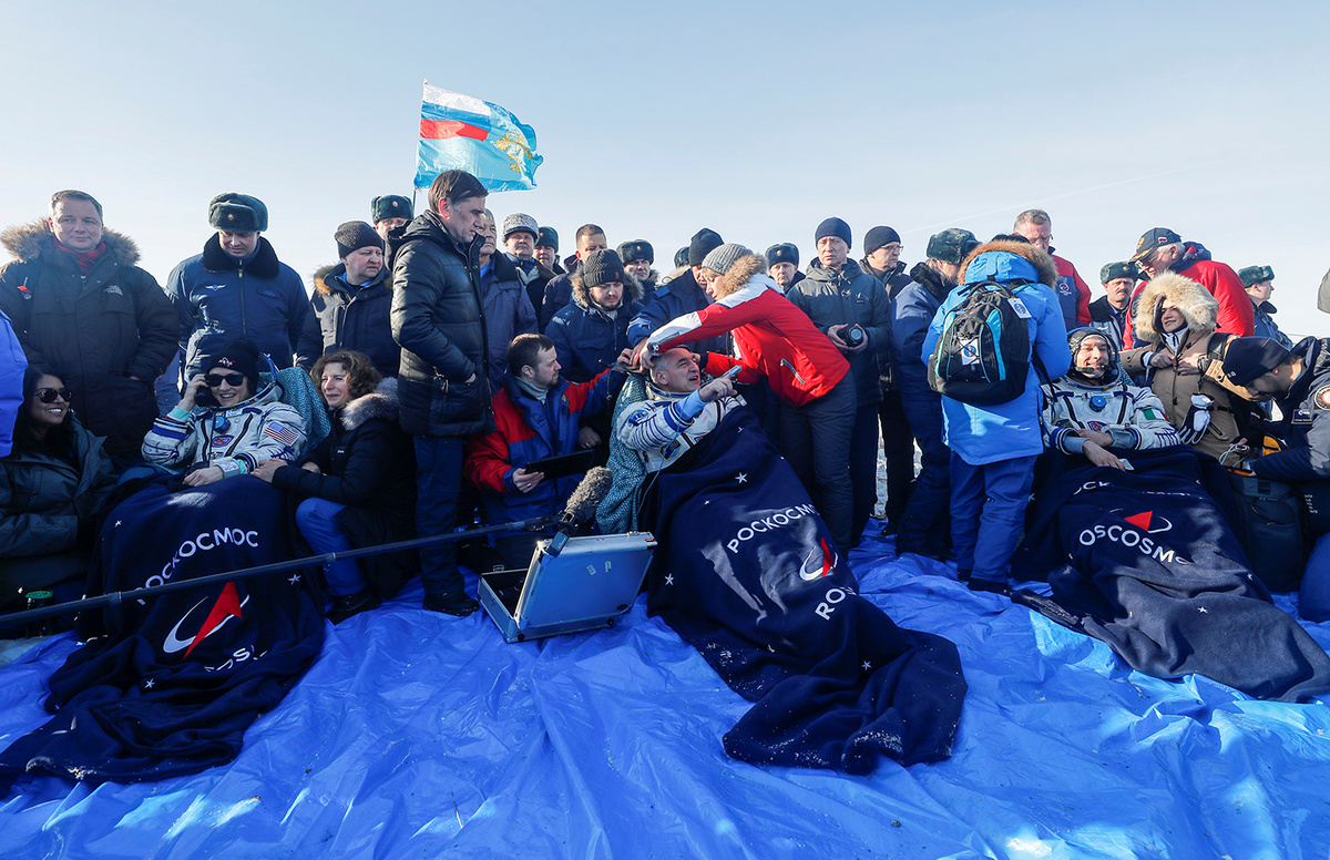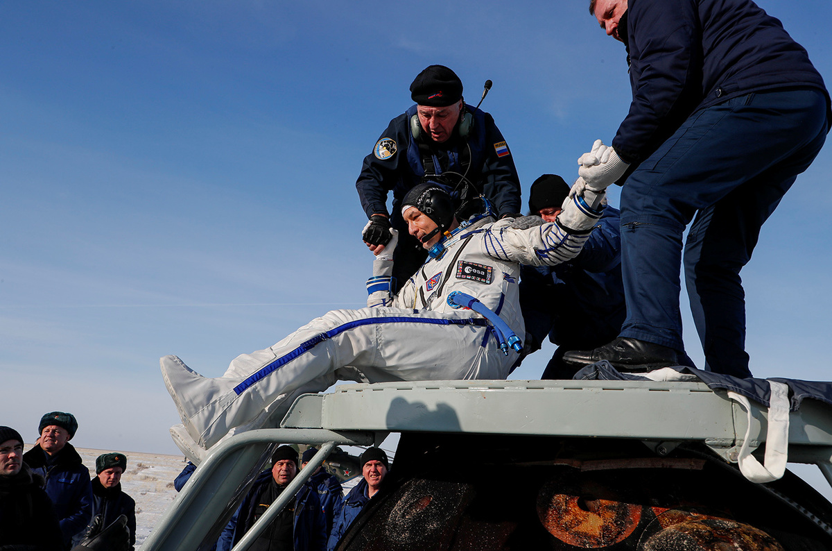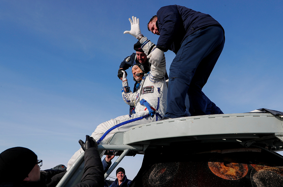 The Soyuz MS-13 capsule touched down on the snowy Kazakh Steppe at 4:12 am ET (0912 GMT) carrying Koch, 41, European astronaut Luca Parmitano of Italy and Russian cosmonaut Alexander Skvortsov.