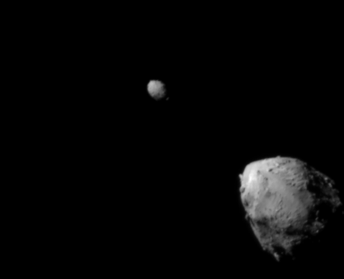 The first images, taken by a camera aboard DART, show the double asteroid system of Didymos – about 2,500 feet (780 meters) in diameter – being orbited by the smaller asteroid Dimorphos that is about 525 feet (160 meters) long.