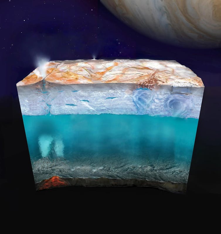 At the surface, Europa is bombarded by high levels of space radiation, concentrated by Jupiter. But deeper down, the thick ice sheet could be protecting life in the liquid subsurface ocean.