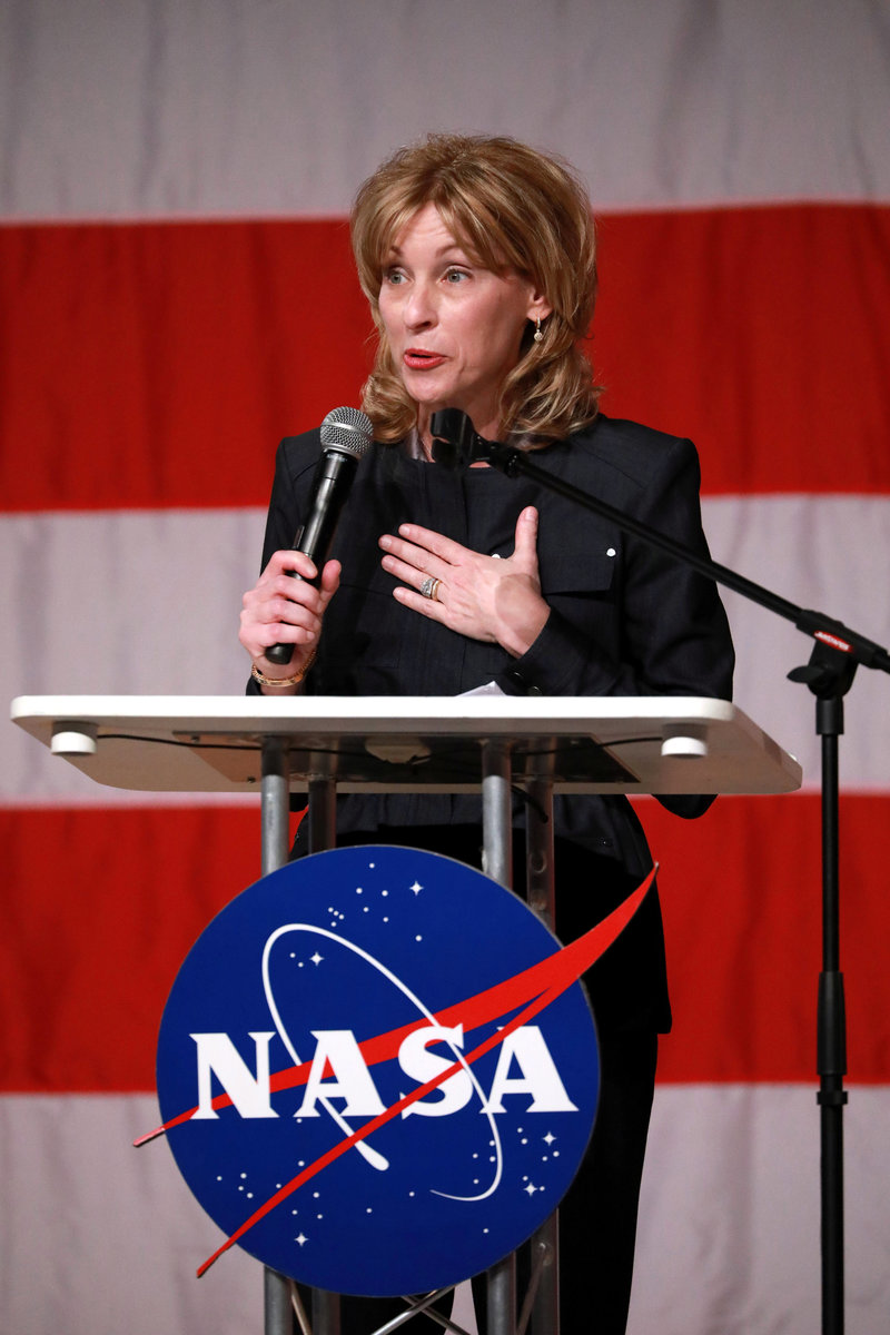 Astronaut Nicole Mann is introduced as NASA announces the crew assignments for the first flight tests, missions of the Boeing CST-100 Starliner and SpaceX Crew Dragon, at NASA's Johnson Space Center in Houston, Texas, U.S., August 3, 2018. REUTERS/Richard Carson