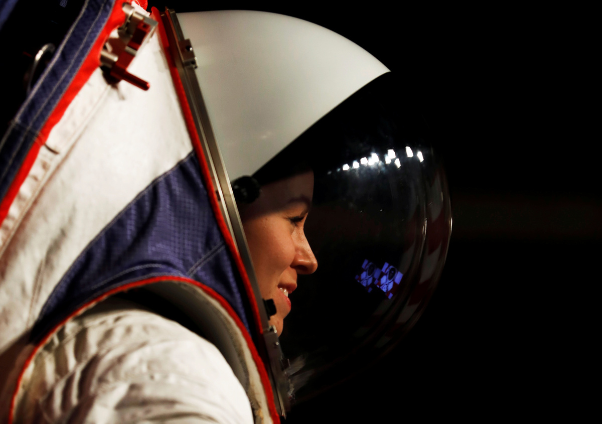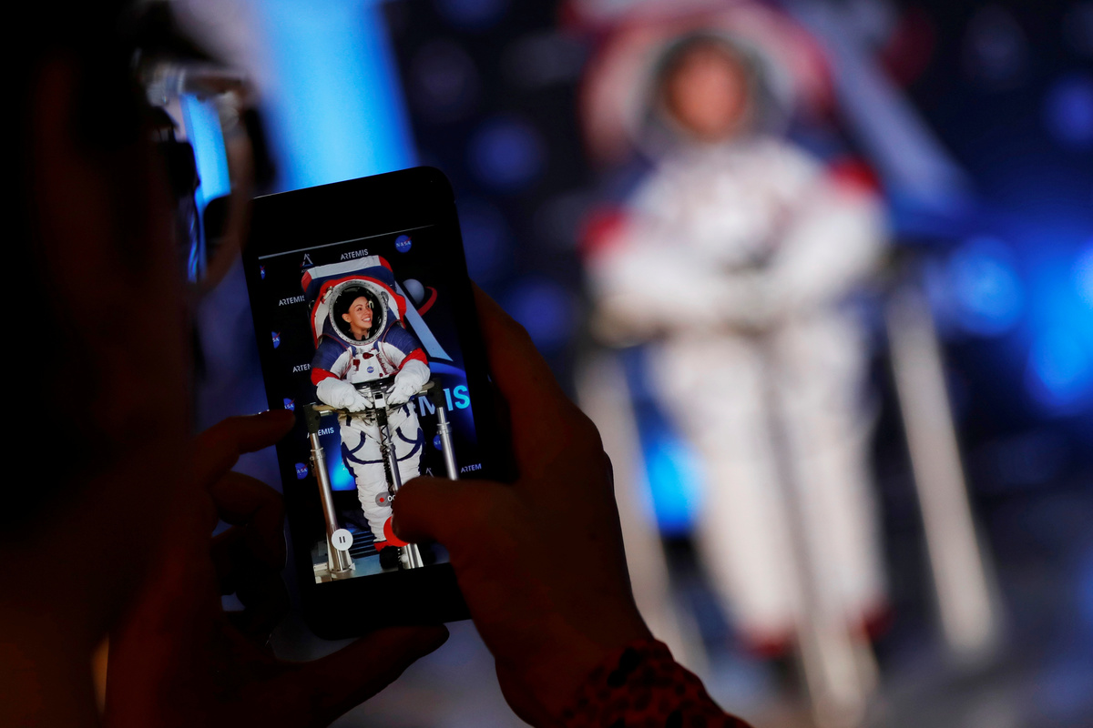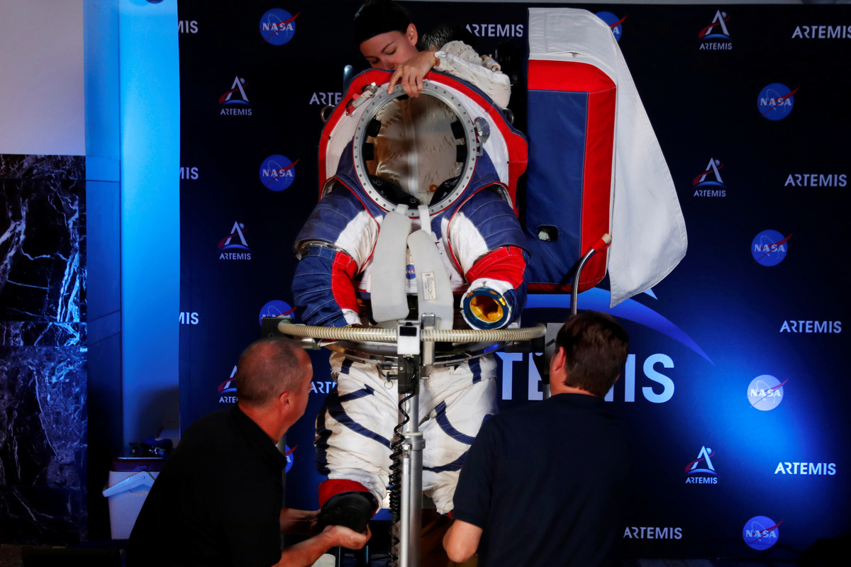Advanced Space Suit Engineer at NASA Kristine Davis wears the xEMU prototype space suit for the next astronaut to the moon by 2024, during its presentation at NASA headquarters in Washington, U.S., October 15, 2019. REUTERS/Carlos JassoVisitors take pictures of Advanced Space Suit Engineer at NASA Kristine Davis as she wears the xEMU prototype space suit for the next astronaut to the moon by 2024, during its presentation at NASA headquarters in Washington, U.S., October 15, 2019. REUTERS/Carlos JassoAdvanced Space Suit Engineer at NASA Kristine Davis wears the xEMU prototype space suit for the next astronaut to the moon by 2024, during its presentation at NASA headquarters in Washington, U.S., October 15, 2019. REUTERS/Carlos JassoAdvanced Space Suit Engineer at NASA Kristine Davis wears the xEMU space suit next to lead engineer Dustin Gohmert wearing the Orion crew survival spacesuit prototype for the next astronaut to the moon by 2024, during a presentation at NASA headquarters in Washington, U.S., October 15, 2019. REUTERS/Carlos JassoAdvanced Space Suit Engineer at NASA Kristine Davis gets into the xEMU prototype space suit for the next astronaut to the moon by 2024, during its presentation at NASA headquarters in Washington, U.S., October 15, 2019. REUTERS/Carlos JassoA visitors takes a picture of Advanced Space Suit Engineer at NASA Kristine Davis as she wears the xEMU prototype space suit for the next astronaut to the moon by 2024, during its presentation at NASA headquarters in Washington, U.S., October 15, 2019. REUTERS/Carlos JassoAdvanced Space Suit Engineer at NASA Kristine Davis takes off the new xEMU space suit for the next astronaut to the moon by 2024, during its presentation at NASA headquarters in Washington, U.S., October 15, 2019. REUTERS/Carlos JassoAdvanced Space Suit Engineer at NASA Kristine Davis gets into the xEMU prototype space suit for the next astronaut to the moon by 2024, during its presentation at NASA headquarters in Washington, U.S., October 15, 2019. REUTERS/Carlos JassoAdvanced Space Suit Engineer at NASA Kristine Davis wears the xEMU prototype space suit for the next astronaut to the moon by 2024, during its presentation at NASA headquarters in Washington, U.S., October 15, 2019. REUTERS/Carlos Jasso