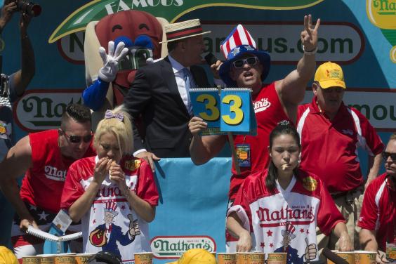 Mr Chestnut finished with 70 hot dogs in 10 minutes - Mr Stonie had just 53. Red but pleased, Joey Jaws smiled to the crowds and raised his arms, victorious.