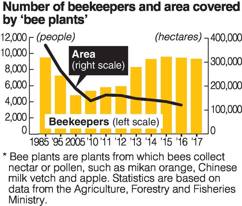 The number of beekeepers nationwide has been increasing in recent years. According to the Agriculture, Forestry and Fisheries Ministry, there were 9,499 beekeepers in 1985. Due to aging, a lack of people to carry on the trade and other factors, this had about halved to 4,790 people in 2005.