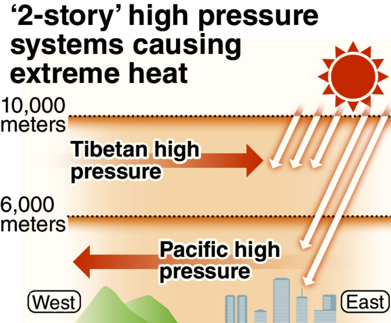 Pacific high atmospheric pressure, which is at an elevation of about 6,000 meters and brings warm air in summer from the east, has combined with Tibetan high pressure, which is at about 10,000 meters and comes from the Asian continent to the west. Together, the two have brought strong sunlight.