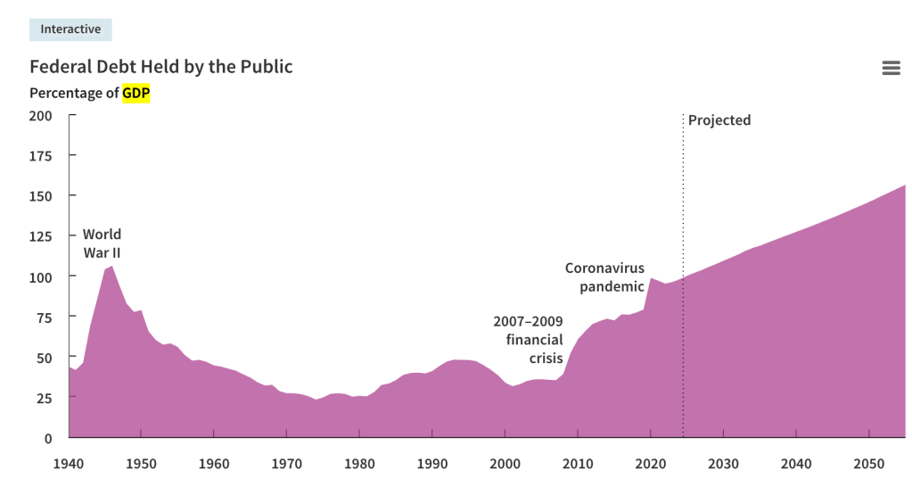 Experts across the economy have been warning for years that America‘s fiscal trajectory is not stable. They point not to the volume of debt, but rather the levels the U.S. is adding to its debt obligations in relation to how quickly its economy is growing, known as the debt-to-GDP ratio. At present, that balance sits at around 125% according to Treasury data, but is expected to hit 156% by 2055, according to the Congressional Budget Office (CBO).