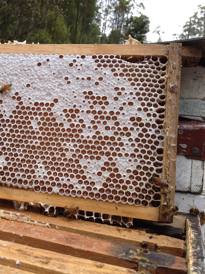 Surrounded by bees and eucalypt trees, he delicately pulls at the combs of stringy leatherwood honey. He says there is more than he had expected, which bodes well for the coming months.