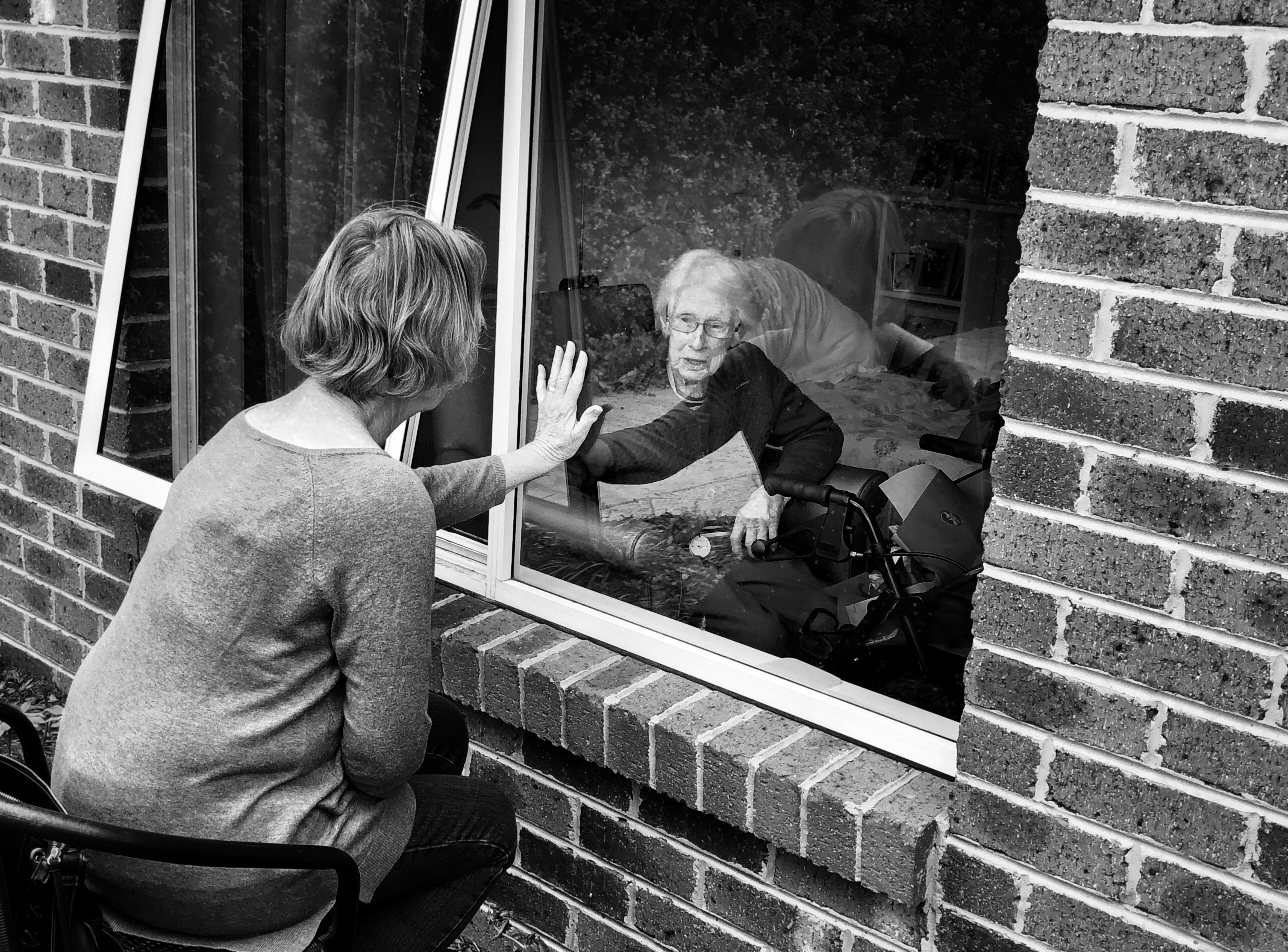 A poignant image of a daughter and her elderly mother separated by a window pane, captures a universal experience of COVID-19.