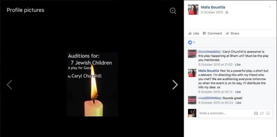 The "Seven Jewish Children" production was organised as part of Israel Apartheid Week events in 2010. In a Facebook post, the now NUS president called the play “powerful” and “very relevant”.