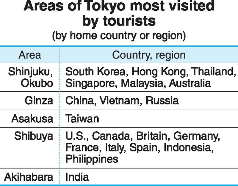 Tourists from Taiwan head to Asakusa, while Akihabara is popular with Indians. Americans and Europeans, meanwhile, prefer Shibuya.