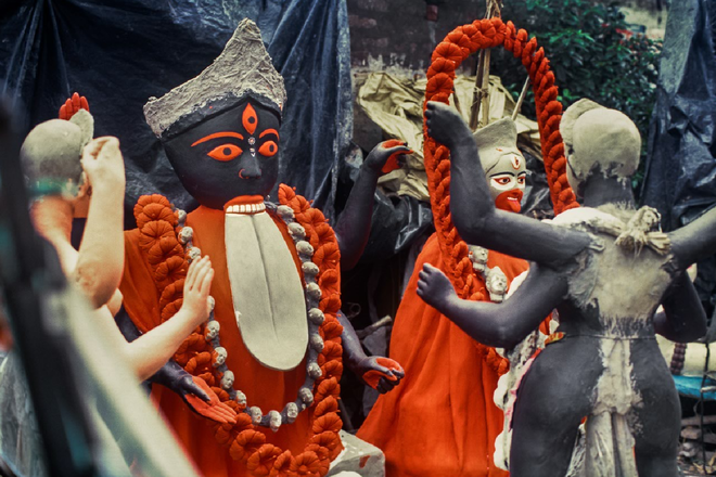 Interspersed are photos from The Green Room of the Goddess, depicting the creation of pujo idols in Kumartuli, the warren of tiny lanes in north Kolkata that is both home and workshop to artisans, potters and artists. One catches glimpses of Kali standing astride Shiva in the frames, garlands of hands covering waists, partially-painted faces of the goddess, disembodied heads, workers, and structural debris. As Mortimer Chatterjee, of Chatterjee & Lal, says as an introduction to the show, “Kishore emotes through his photography — whether it’s an inanimate mannequin or an actor. He is able to tease out incredibly intense moments of action and dynamism.”