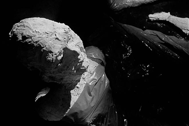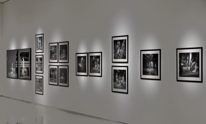 The last series, which lends its name to the exhibition, was created in 2002. In January that year, artist Tom Lai designed the Seagull Book Stand for the Calcutta Book Fair, using a series of life-size faceless and genderless clay statues from Kumartuli. They were situated in various aspects of suffering and captivity, expressing the lack of agency allowed to the common people. Later that year, Kishore re-used the statues — this time placed against light, smoke and projections in a theatrical shoot — to comment on what the genocide in Godhra portended for India.