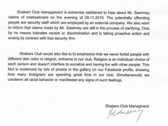 He said in his Facebook post: "[The police] made a note of the bouncer’s details, but told me that I shouldn’t expect the same treatment in Poland that I would get in the UK. That in Poland, white people and brown people are different."