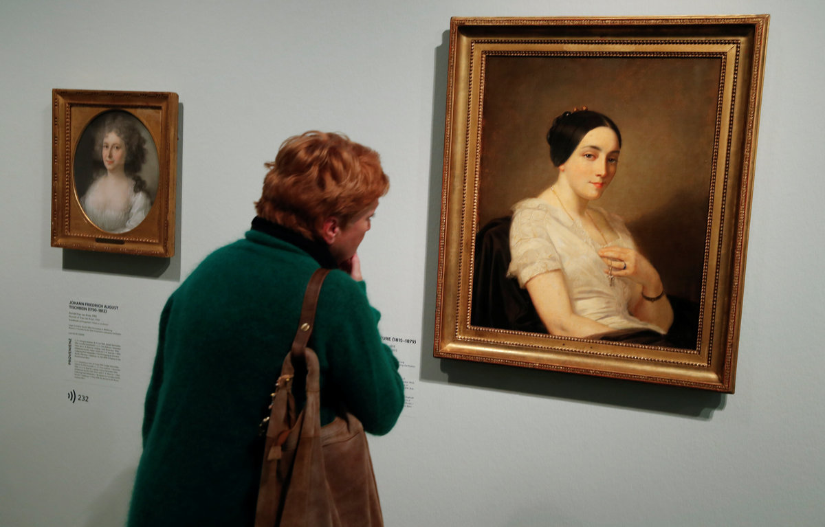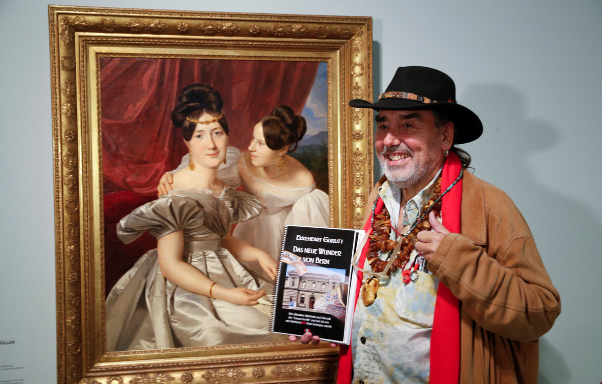 Ekkehard Gurlitt, a second cousin of Cornelius Gurlitt poses in front of an oil painting entitled "Portrait of two Women" (1831) by Ferdinand Waldmueller, which is identified as Nazi-looted art during a media preview of the "Gurlitt: Status Report - Nazi Art Theft and its Consequences" exhibition at the Bundeskunsthalle in Bonn, Germany, November 2, 2017. REUTERS/Wolfgang Rattay A woman looks at an oil painting entitled "Portrait of a Young Woman" by French artist Thomas Couture (1815-1879), which is identified as a Nazi-looted art during a media preview of the "Gurlitt: Status Report - Nazi Art Theft and its Consequences" exhibition at the Bundeskunsthalle in Bonn, Germany, November 2, 2017. REUTERS/Wolfgang RattayEkkehart Gurlitt, a second cousin of Cornelius Gurlitt, and his muse "Lady Mokka" pose in front of an oil painting entitled "Portrait of two Women" (1831) by Ferdinand Waldmueller, which is identified as Nazi-looted art, during a media preview of the "Gurlitt: Status Report - Nazi Art Theft and its Consequences" exhibition at the Bundeskunsthalle in Bonn, Germany, November 2, 2017. REUTERS/Wolfgang Rattay