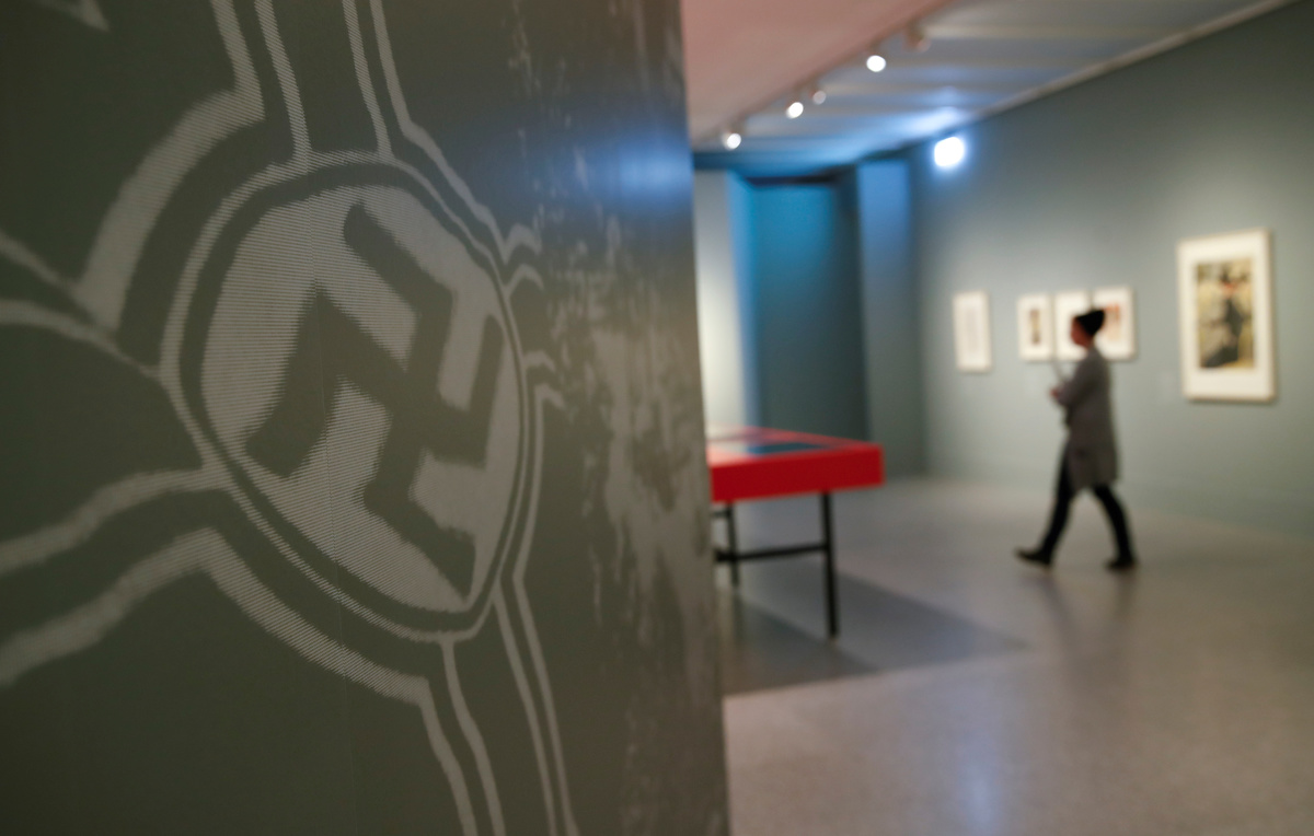 A woman walks past a Swastika during a media preview of the "Gurlitt: Status Report - Nazi Art Theft and its Consequences" exhibition at the Bundeskunsthalle in Bonn, Germany, November 2, 2017. REUTERS/Wolfgang Rattay