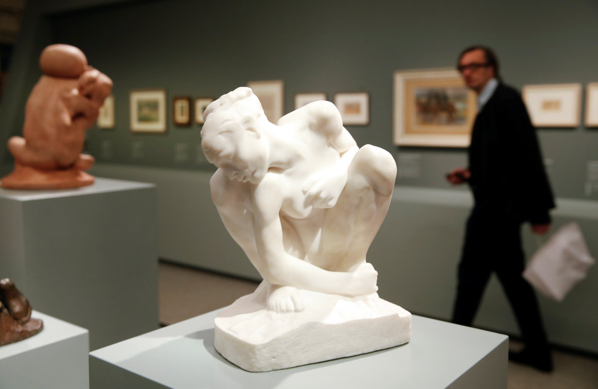 A woman looks at various sculptures of French artist Auguste Rodin during a media preview of the "Gurlitt: Status Report - Nazi Art Theft and its Consequences" exhibition at the Bundeskunsthalle in Bonn, Germany, November 2, 2017. REUTERS/Wolfgang Rattay