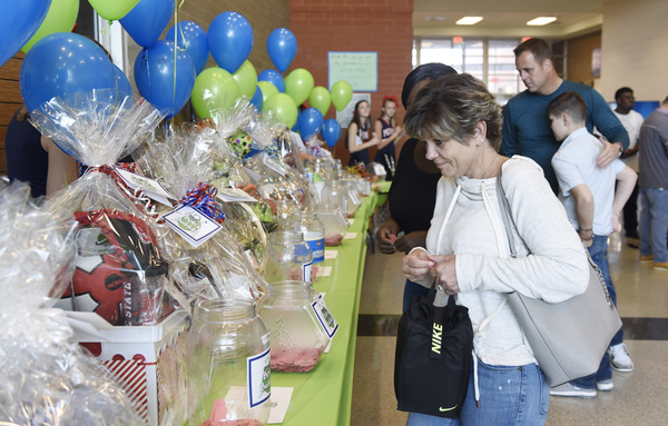 In the gym lobby, gift baskets _ packaged after athletes solicited community donations _ were on display. The lobby bustled from 4 p.m. until the match started at 6 p.m. Fans purchased raffle tickets and dropped their tickets in jars placed in front of the donation items they hoped to win.
