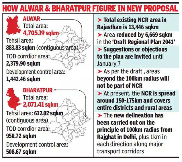 The NCR includes areas from two districts of Alwar and Bharatpur. While in Alwar, NCR land has reduced from 8,380 sqkm to 4,705.19 sqkm, in Bharatpur, the area has fallen from 5,066 sqkm to 2,071.41 sqkm. According to an official, the ‘Draft Regional Plan 2041’ has been put in public domain and suggestions or objections have been invited until January 7.