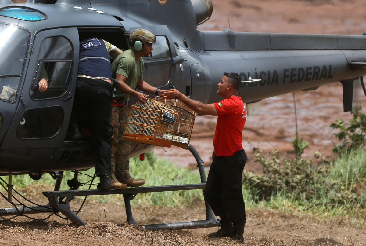 A firefighter carries rescued cages after a tailings dam from Brazilian miner Vale SA burst in Brumadinho, Brazil January 27, 2019. REUTERS/Adriano Machado
