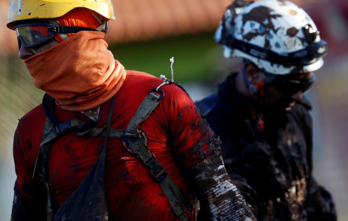 Members of rescue team return from the mission, after a tailings dam owned by Brazilian mining company Vale SA collapsed, in Brumadinho, Brazil January 27, 2019. REUTERS/Adriano Machado
