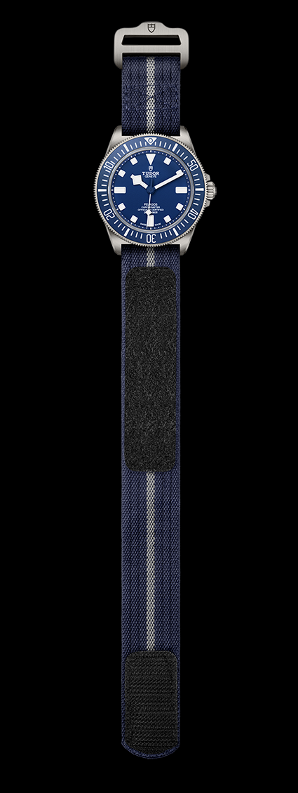 The Pelagos FXD can be worn with a supple rubber strap with an embossed motif or a fabric strap with a new, highly technical construction developed by Tudor and French company Julien Faure, founded in 1864.