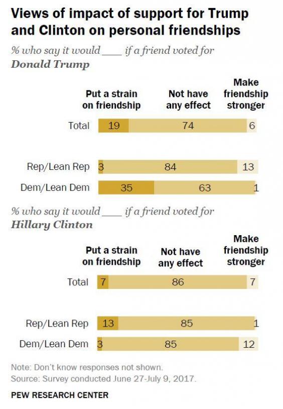 And while partisanship and tribalism are pretty bipartisan things in American politics today, Democrats are actually substantially less able to countenance friends who supported the wrong candidate: Just 13 percent of Republicans say a friend's support of Hillary Clinton would strain their relationship.