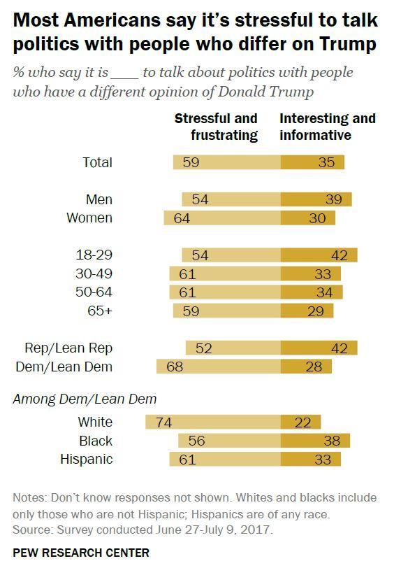 One final data point from the new Pew study: 68 per cent of Democrats and Democratic-leaning voters say they find it “stressful and frustrating” to talk to people who have a different opinion of Trump. About half — 52 percent — of Republican and GOP-leaning voters say the same.