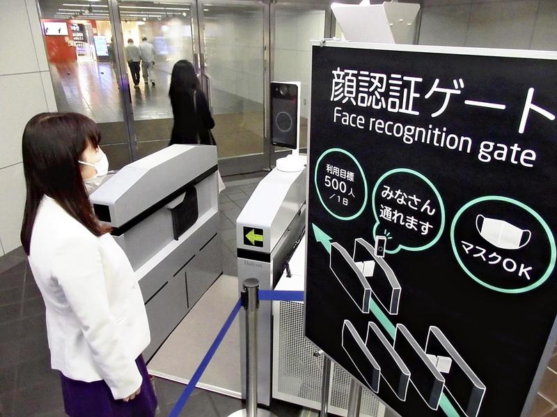 A facial recognition system that allows for masks to kept on is tested at the security gate of NEC Corp.'s home office in Minato Ward, Tokyo.