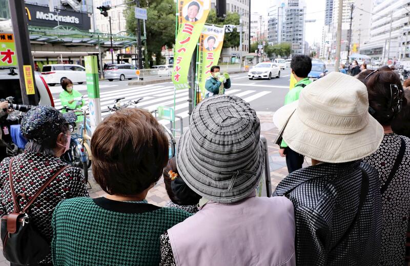 On the night of Oct. 24, with a week to go before the House of Representatives election, the plaza in front of Hankyu Railway's Takarazuka Station in Takarazuka, Hyogo Prefecture, was unusually crowded. The eyes of the crowd were on a man wearing a parka in yellow-green -- the symbolic color of Nippon Ishin no Kai (Japan Innovation Party).