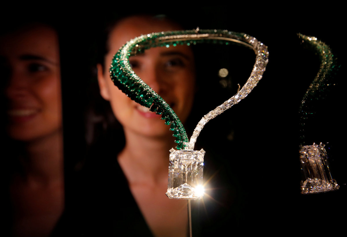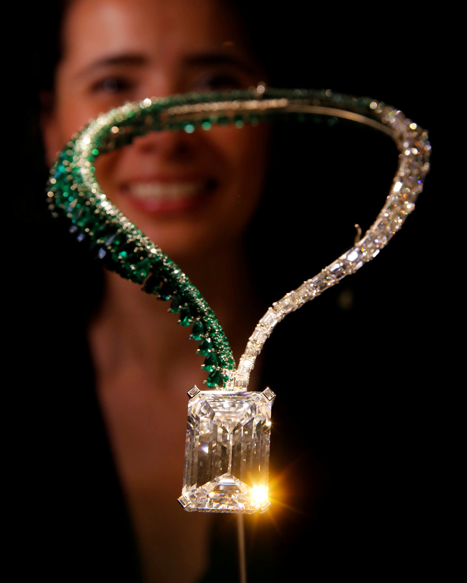The necklace, known as the Art of de GRISOGONO, Creation 1, has a rectangular diamond weighing 163.41 carats as its centerpiece. The stone, found in Angola in 2016, is framed on one side by rows of diamonds and on the other by pear-shaped emeralds.