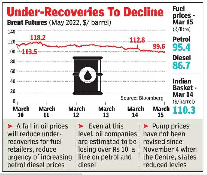 A decline in oil prices will reduce the pain for fuel retailers by reducing their under-recovery on petrol and diesel, which had risen to about Rs 20 or so as Brent hit $139/barrel on March 7.