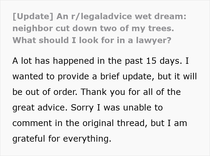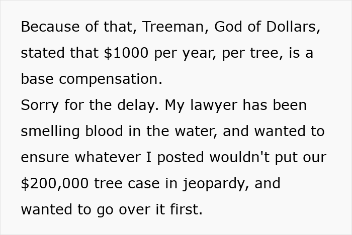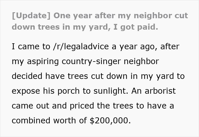 Unfortunately, this man didn’t bother to look into the consequences of cutting neighbors’ trees without permission, which ended up costing him around $200K. His actions caused a whole ordeal with the next-door resident, which you can read about in more detail below.