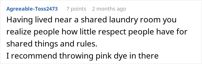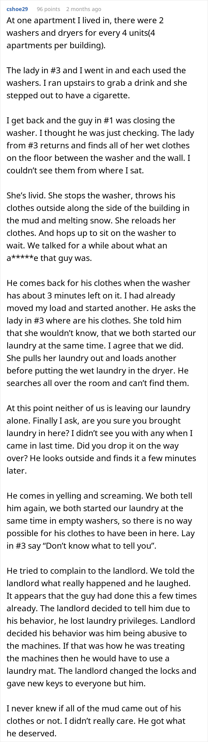 Many people believed the author’s neighbor deserved what happened, seeing it as justified payback for breaking the laundry room rules