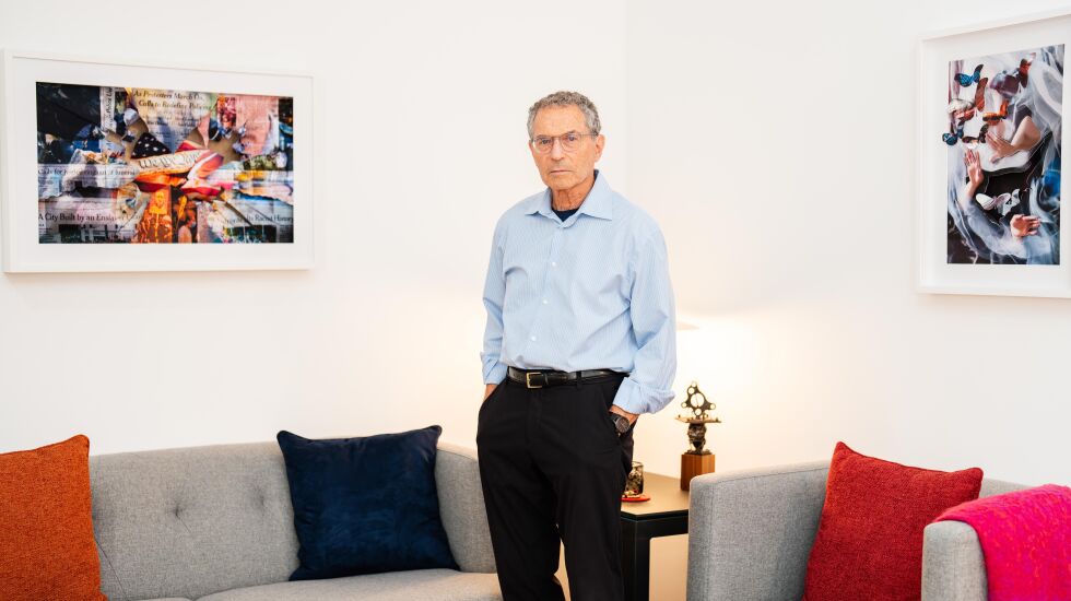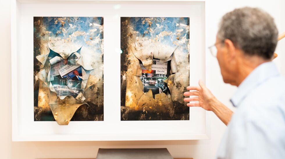 “We’re always trying to be very relevant with our exhibits,” said Weinberg, 79, whose office is filled with artwork he’s made based on social justice issues. One piece juxtaposes headlines from daily newspapers with images from television news during the protests over the murder of George Floyd in 2020. Another piece, a diptych, shows the daily news headlines that Weinberg views as transitory problems and those that, in his view, pose an existential threat to the country.