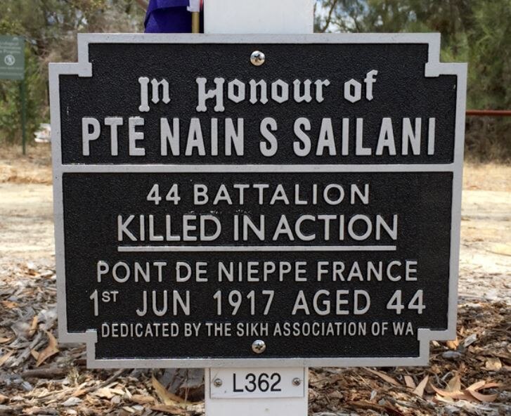 Private Sailani had migrated from India to Australia in 1895 as a 22-year-old and initially lived in the town of Geraldton, about 400 kilometres north of Perth, where he found work as a labourer.