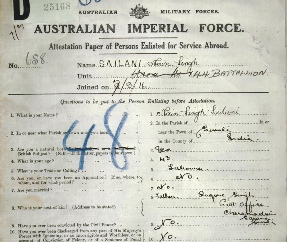 The outbreak of the First World War saw Private Sailani enlist at Claremont, in Perth, in February 1916 with C company of the 44th infantry battalion in the Australian Imperial Force.