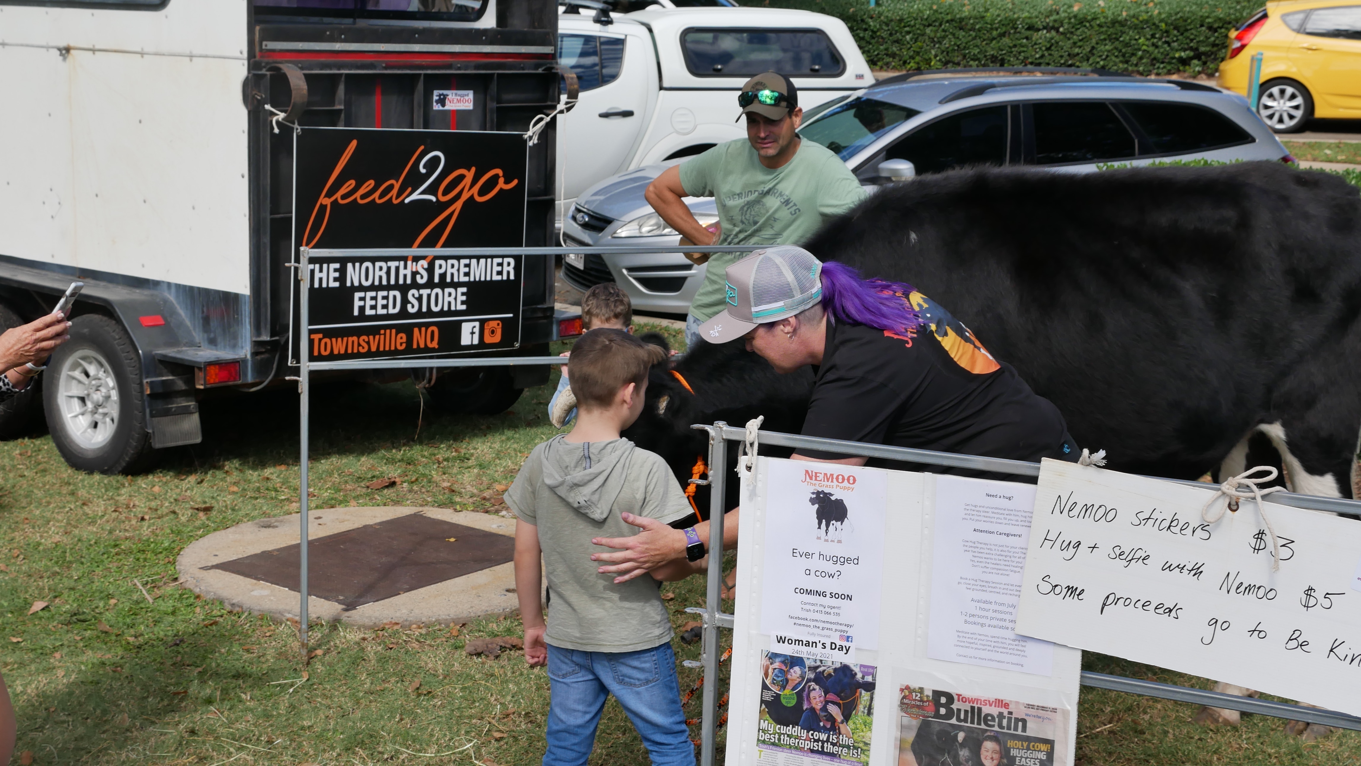 Townsville residents had no problem finding Nemoo the Friesian steer over the weekend — he was relieving stress, one hug at a time, and posing for photos.