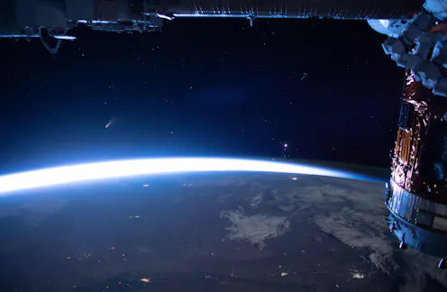 The cause of this really long return time is the elliptical shape of Neowise’s orbit around the Sun. In the early 17th century, astronomer Johannes Kepler derived his laws of planetary motion, which apply to any object orbiting in space, including comets. These laws state that objects on highly elliptical orbits will move fast near the barycenter – the centre of mass of two or more bodies that orbit one another – of the path and much slower further away.