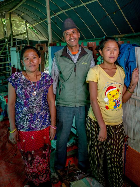 Forty members of the Tamang family, who come from the remote Baruwa village in Sindhupalchok District, have created a small carpet factory within Bode camp. Among them are Damay Singh Tamang, 46, pictured below with his wife and their daughter