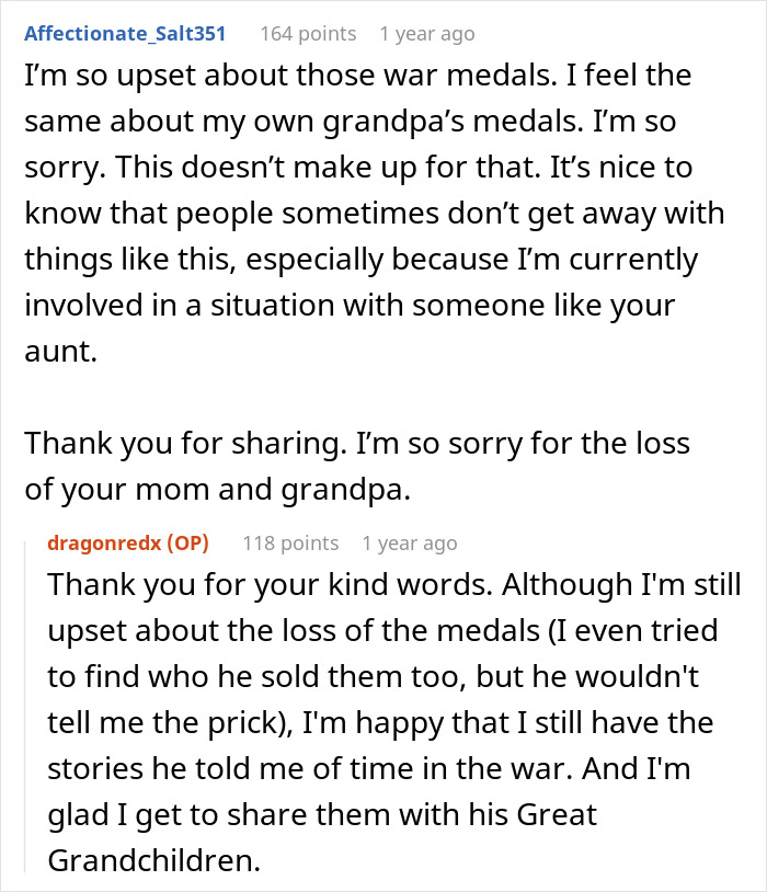 The poster updated that he couldn’t even get his grandfather’s war medals, which were a part of the inheritance, as his aunt’s son had already sold them off
