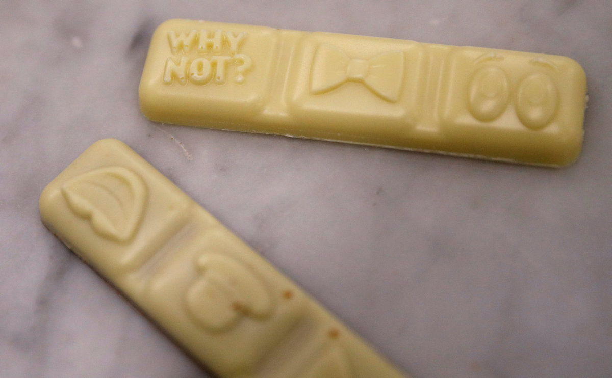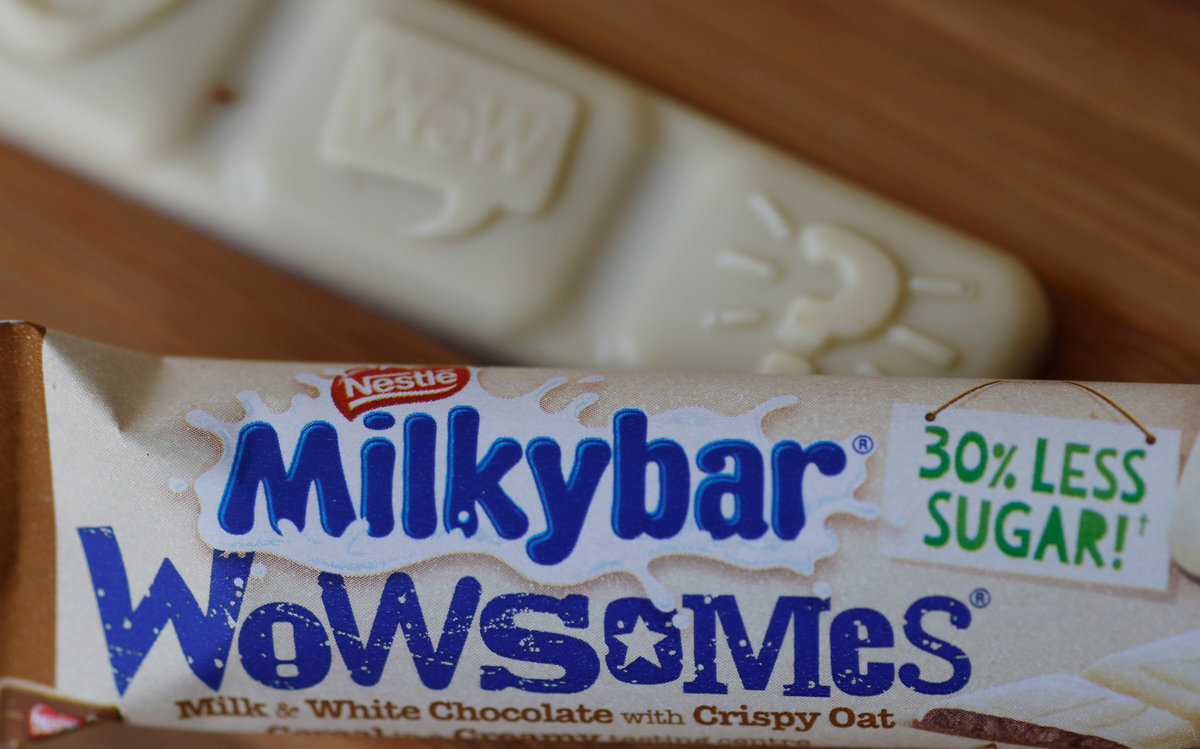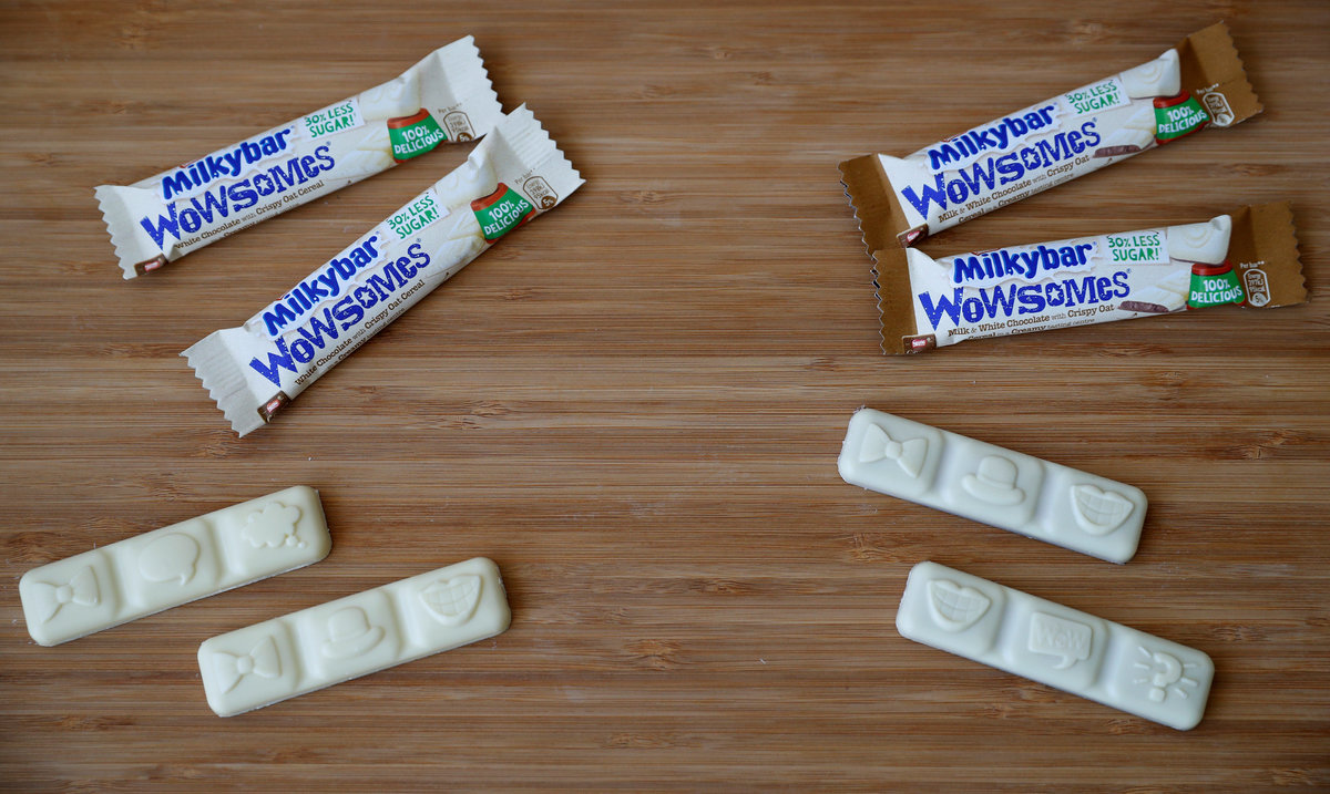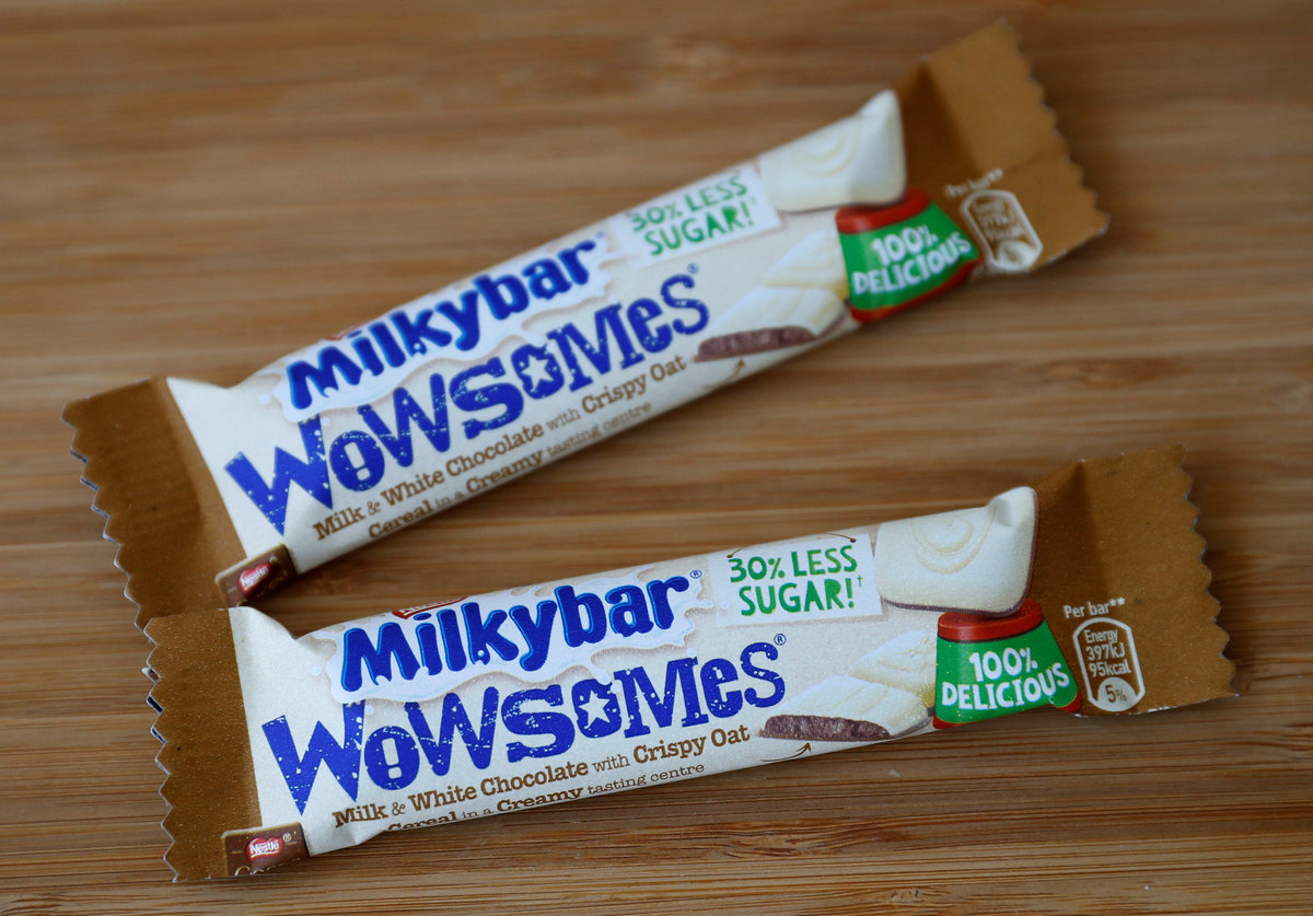 Unlike the original plain white Milkybar chocolate, Wowsomes have a chocolate shell around a creamy center containing both the lighter sugar and crisped oat cereal.