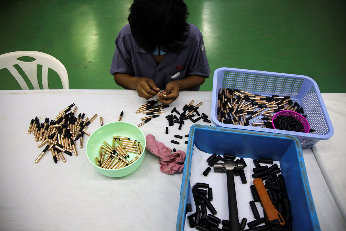 Workers at Qualy's recycling factory in the central city of Ayutthaya wash the nets before feeding them into a shredder that yields blue nylon granules to be mixed with colourants and melted down in product moulds.