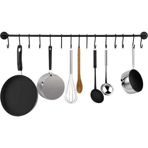 Running out of cabinet space for your pots and pans? Consider hanging them from this rail instead. It’s made from tough iron that can support up to 22 pounds and comes with 15 S-shaped hooks you can use to hang cookware. Or, if your cookware already has a dedicated spot in your kitchen, you can also use it to store utensils.