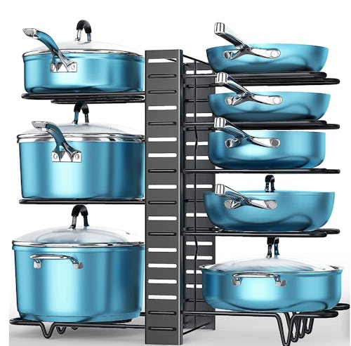 Not only can this rack hold up to eight pots or pans, but the adjustable tiers also make it easy to use with cookware of nearly any shape or size. You also have the choice of setting it up horizontally or vertically — whichever fits your cabinets better. Plus, the heavy-duty iron tiers are unlikely to warp under heavy cast iron.
