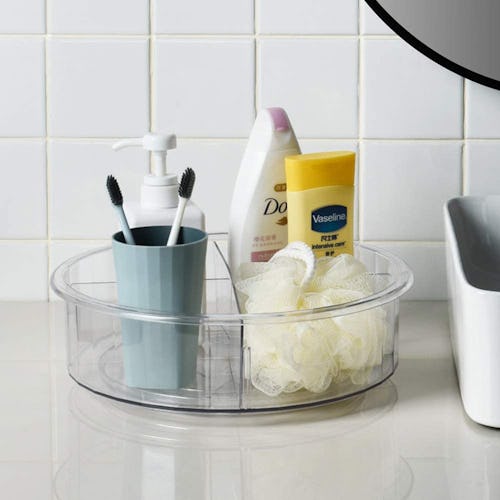 Not only does this lazy Susan feature dividers in the center, but it can also help expand storage space in cramped cabinets. A gentle spin is all it takes in order to bring items stored in the back to the front, making them easy to reach. Or, if your bathroom vanity is looking a little worse for wear, it also works great for storing soaps, skincare bottles, and more.