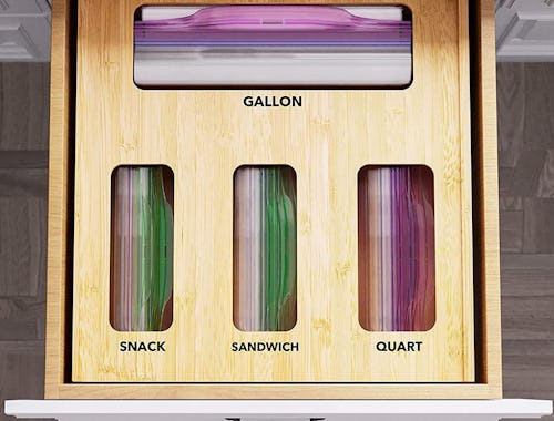 Not only is this baggie box made from sleek bamboo, but it also has space for four different bag sizes: quart, sandwich, snack, and gallon. Each order includes a set of pre-printed labels you can use to help keep track of which baggie box is stored where — and zero assembly is required.