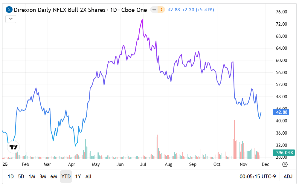 The NFXS ETF: Since the January opener, the NFXS ETF has lost nearly 22%. However, in the past six months, sentiment has improved to a gain of more than 10%.